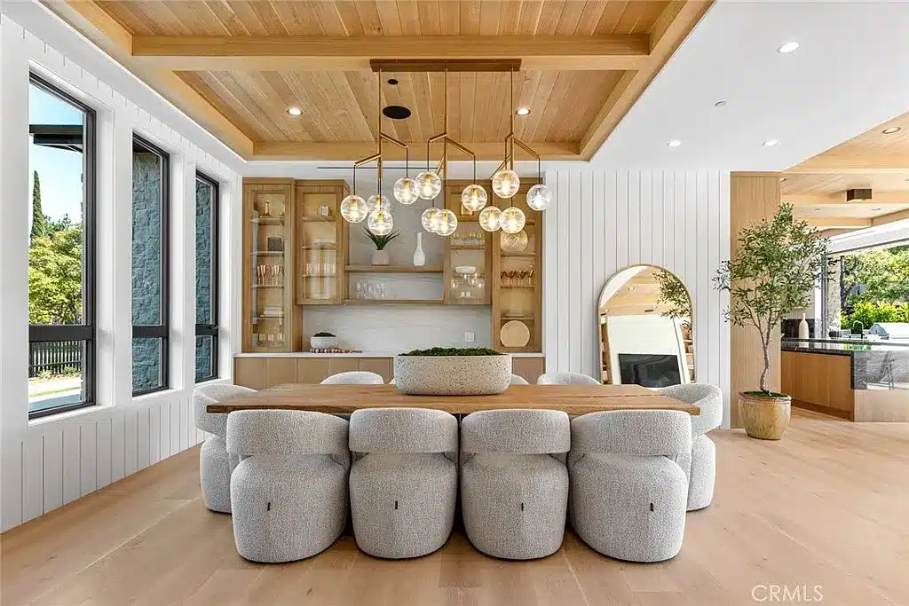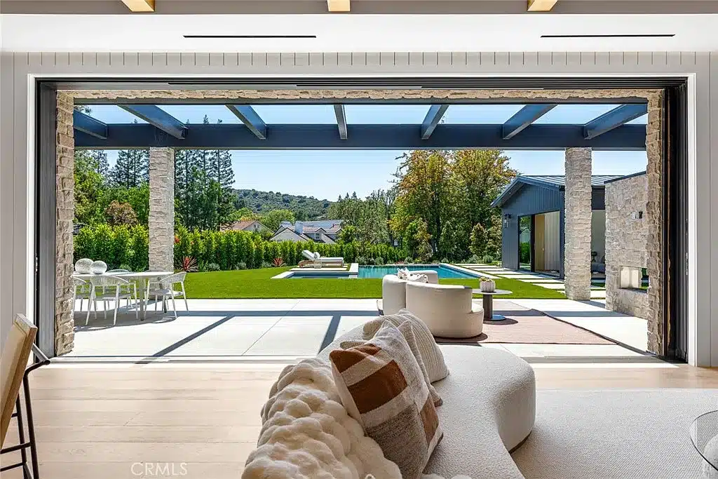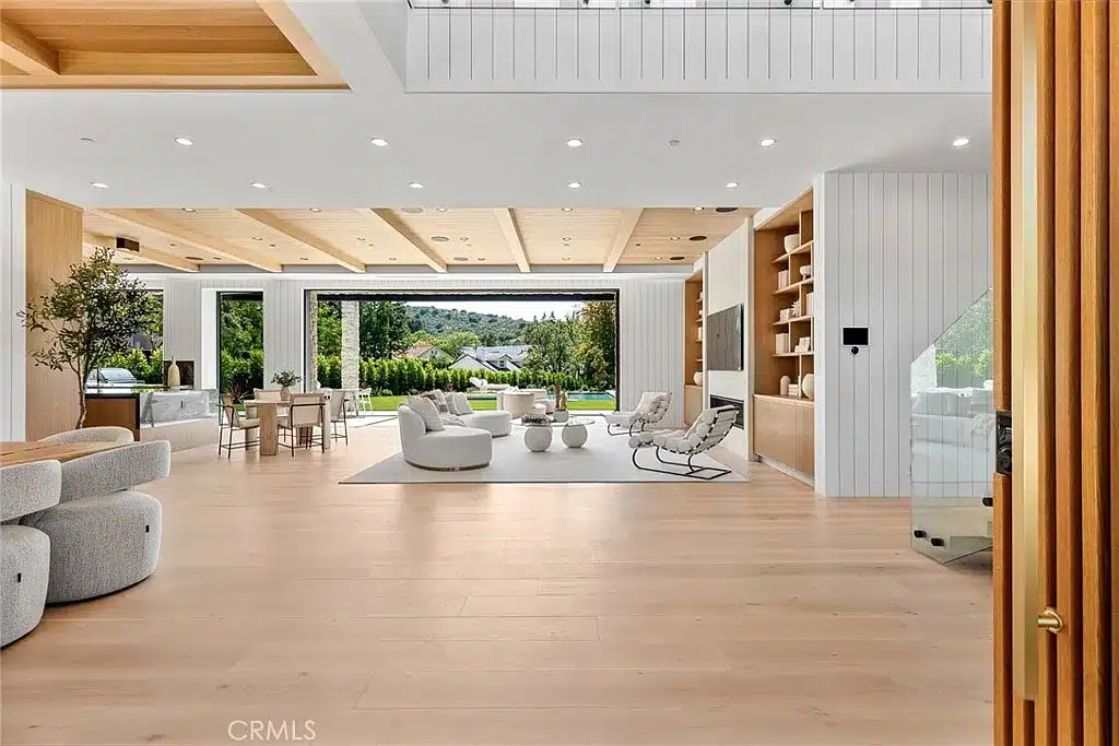 Boasting approximately 5,300 square feet of impeccably finished living space, The Oro is a showcase of high-end materials and thoughtful design. Soaring ceilings and custom wall paneling throughout create a warm yet sophisticated ambiance, enhanced by natural light streaming through expansive sliding glass doors and oversized windows. The seamless flow between indoor and outdoor spaces amplifies the home’s grandeur and livability.