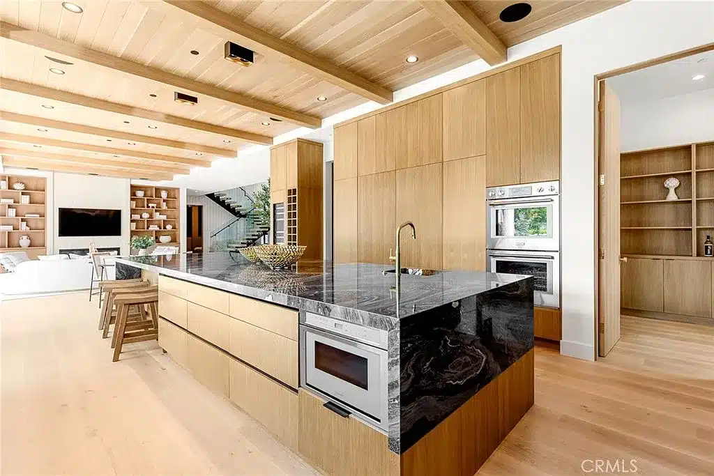 At the heart of the home lies the chef’s dream kitchen, anchored by a stunning 17-foot island topped with book-matched Santorini Grigio Quartzite. Custom rift white oak cabinetry and a full suite of premium Thermador appliances—including four ovens, two dishwashers, wine storage, and a built-in fridge/freezer—make this kitchen a space where form meets function. The open layout flows effortlessly into the spacious family room, perfect for hosting guests or enjoying quiet evenings at home.