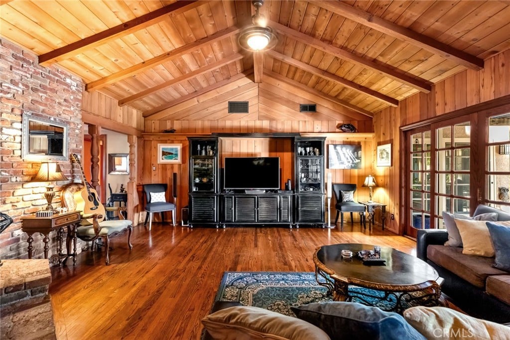 The main house boasts 3 bedrooms and 2 bathrooms, providing comfort and style. Each room is thoughtfully designed to complement the easy flow of the home. Hardwood flooring and custom wood paneling throughout create a warm inviting feel with french doors from several rooms providing access to your outdoor haven.